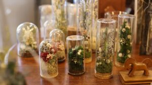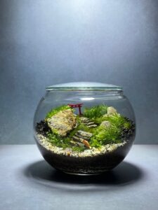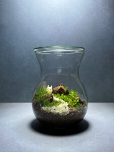 小さなガラス容器にコケ植物を使い、自分の思い描く世界を創ります。